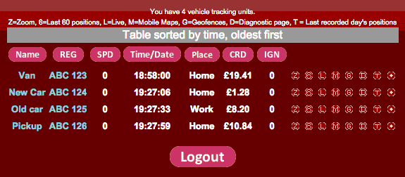 A table like this appears on the left of the website. Click on a red circle on the left of the table, or the red text, to select a vehicle. Alternatively, you can click on one of the small symbols on the right to go directly to some of the information pages for that vehicle. |